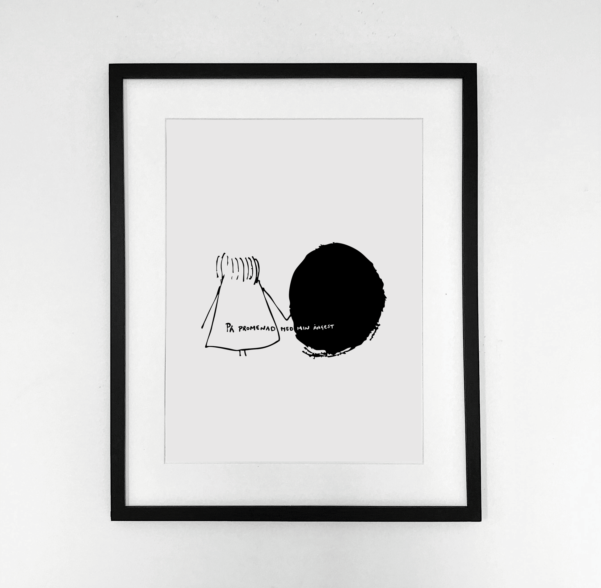 Konsttryck "På promenad med min ångest." Finns i fyra storlekar. De 2 minsta storlekarna är tryckta på ett blankt, helvitt papper. De två större storlekarna är tryckta på ett fint, matt bomullspapper.